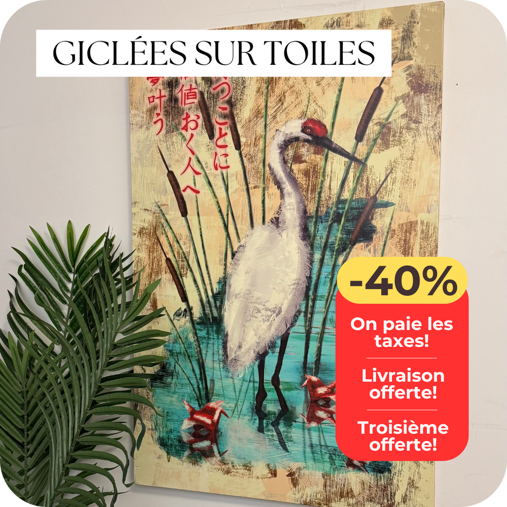 - Les giclées ont un épaisseur de 2 cm, sont montées sur un cadre de bois ferme avec des crochets.