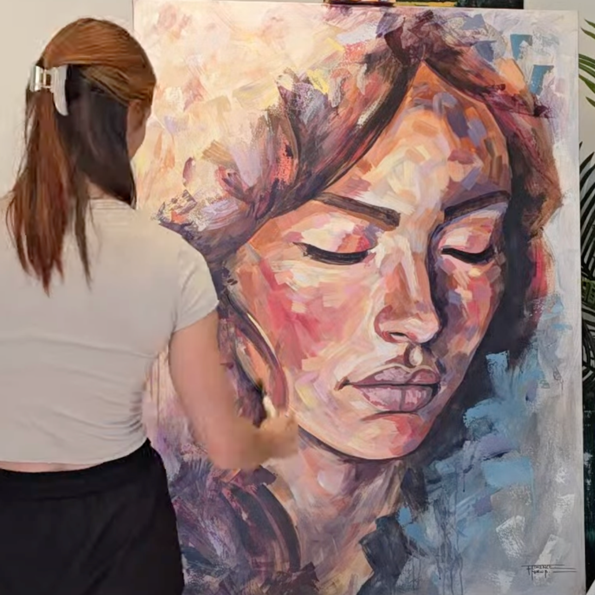 Florence est une ariste montréalaise travaillant à l'acrylique et au fusain. Elle vous partage ses reflexions sur le thème de la technologie, de l'humain et de la force au féminin à travers son art.