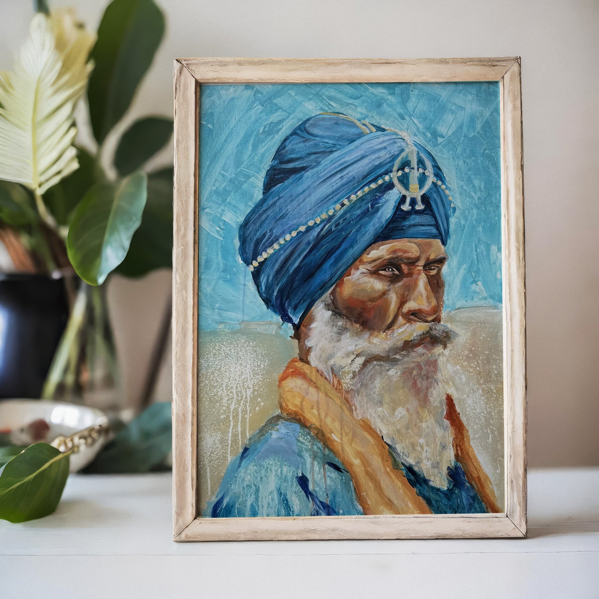 L’inspiration de cette œuvre m’est venue en découvrant une référence photographique dont le visage m’a immédiatement captivée : un homme au turban bleu, digne et marqué par le temps, dont le regard semblait porter à la fois la sagesse et la force intérieure. Sans connaître son histoire, j’ai ressenti l’envie de réinterpréter son expression à travers ma propre sensibilité artistique, en jouant avec les textures, les contrastes et les nuances de bleu pour mettre en lumière la profondeur silencieuse qu’il dégageait. Cette peinture est ainsi devenue un hommage à la beauté intemporelle des visages qui racontent, par leur seule présence, un univers de vécu et d’émotions.